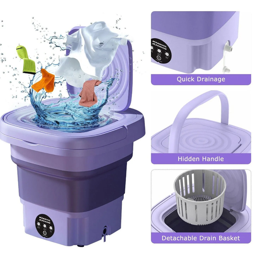 Esta Mini Lavadora te ofrece la misma eficiencia de una lavadora tradicional de tamaño compacto. Con su exclusivo diseño plegable, nunca más tendrás que preocuparte por el espacio de almacenamiento o buscar una lavandería cuando estes de viaje.